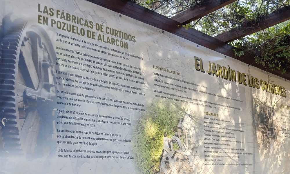 Para la ocasión, los responsables del Aula de Educación Ambiental, han mejorado el aspecto de la maquinaria y confeccionado un nuevo panel explicativo, en base a la documentación donada por María Esperanza Morón, sobre la industria del curtido en Pozuelo de Alarcón. Como la cedula de la primera fábrica fechada en 1748.