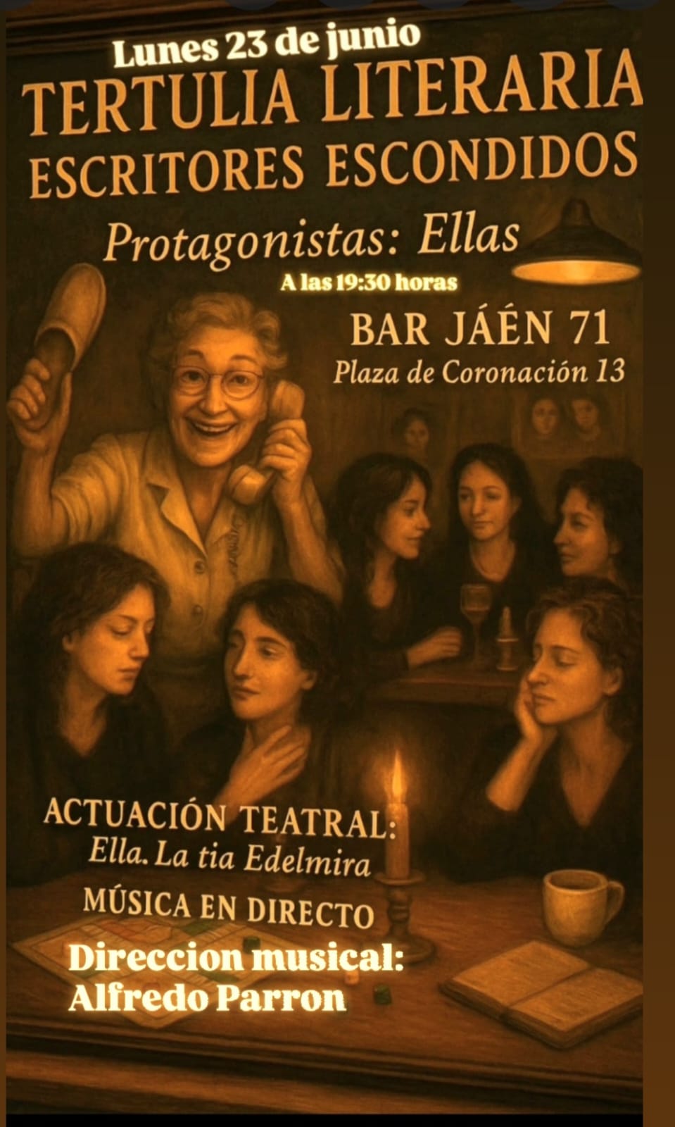 Precisamente en Jaén 71 se celebrará el próximo lunes 23 de junio, a las 19:30 horas, una muy especial bajo el título de «Protagonistas: Ellas». El encuentro incluye, además de las lecturas, la representación teatral «Ella. La tía Edelmira», basada en la serie literaria de Manuel Elizalde, adaptada por el propio autor y protagonizada por Milagros Morón, música en directo y un concurso de microrrelatos.