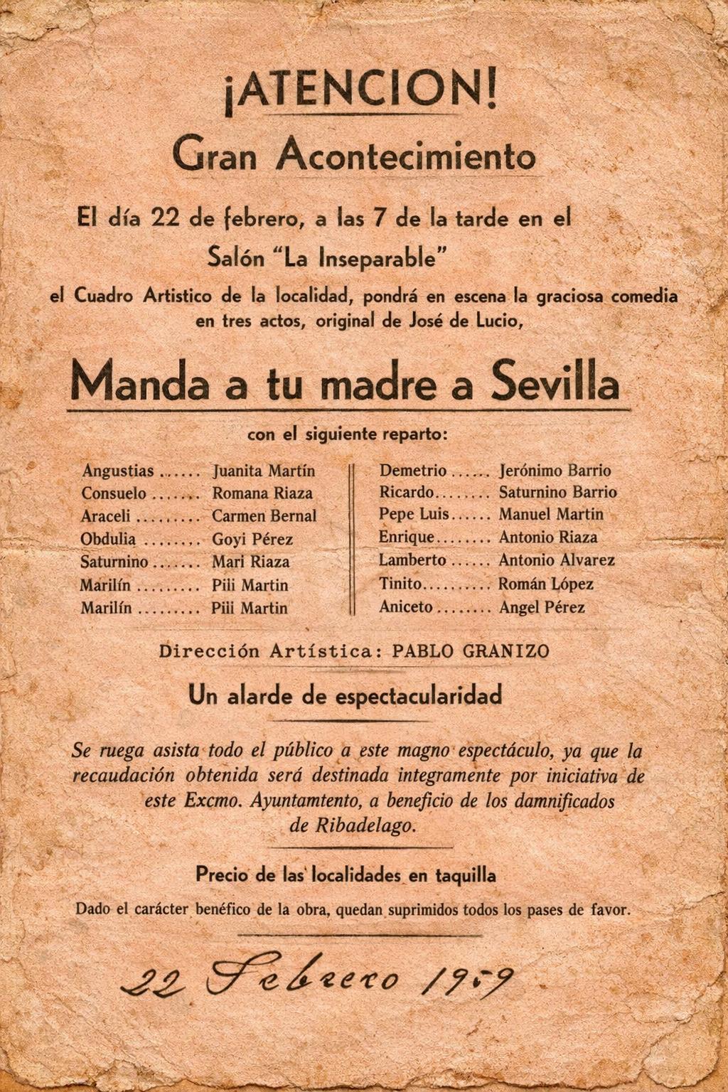 La magia del momento no evitó que me diera un vuelco al corazón. La recaudación de aquel alarde de espectacularidad interpretado por trece actores, bajo la dirección artística de Pablo Granizo, iba destinada, por iniciativa del Ayuntamtento, a los damnificados de Ribadelago, un pueblecito de la comarca de Sanabria (Zamora) a la que siempre hay que volver. Mi madre me había contado que una riada, originada tras la rotura de la presa de Vega de Tera, lo arrasó. El 9 de enero de 1959. Perdieron la vida 144 de sus 532 habitantes.