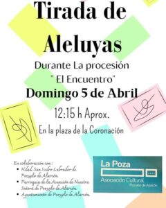 La palabra aleluya procede del hebreo hallĕlū yăh, que significa «alabad a Yahveh» o «alabad al Señor». Es un término que invita a la alabanza usado en la tradición judía y cristiana para expresar alegría y adoración. Sobre todo en Pascua. Aquí llamamos así a la estampita de papel que se lanza en la de Resurrección. Coincidiendo con la Procesión del Encuentro. En la plaza de la Coronación. Desde la barbacana y el campanario de la parroquia de la Asunción de Nuestra Señora. Justo cuando finaliza la Semana Santa y la madre se encuentra con el hijo resucitado. La tradición de lanzar aleluyas en Pozuelo de Alarcón, recuperada por la Asociación Cultural La Poza, se remonta al siglo XIX. Indagando en el origen hemos llegado a dos mujeres, tías de Antonio Becerril, que a finales de ese siglo compraron propiedades en la colonia de la Paz y pudieron traer al pueblo la costumbre levantina. Que conocían por sus orígenes. La nieta del abogado y político, Margarita Becerril, nos ha contado la historia de su familia y cómo en los años cincuenta del pasado siglo recortaba aleluyas que volaban el Domingo de Resurrección.