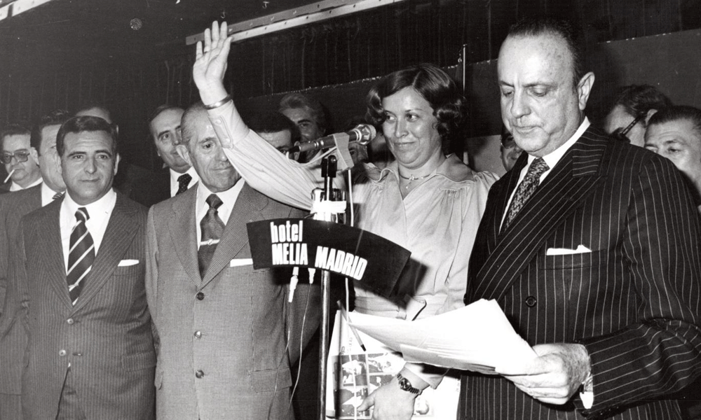 Teresa de los Mozos y Manuel Fraga en la presentación de la candidatura nacional de Alianza Popular. Hotel Melia de la Avenida de América. 1976.